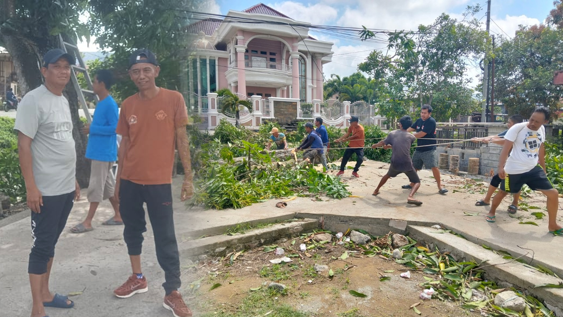Bukan hanya jalan cor. Di sisi lain lapangan, warga sedang menebang pohon.