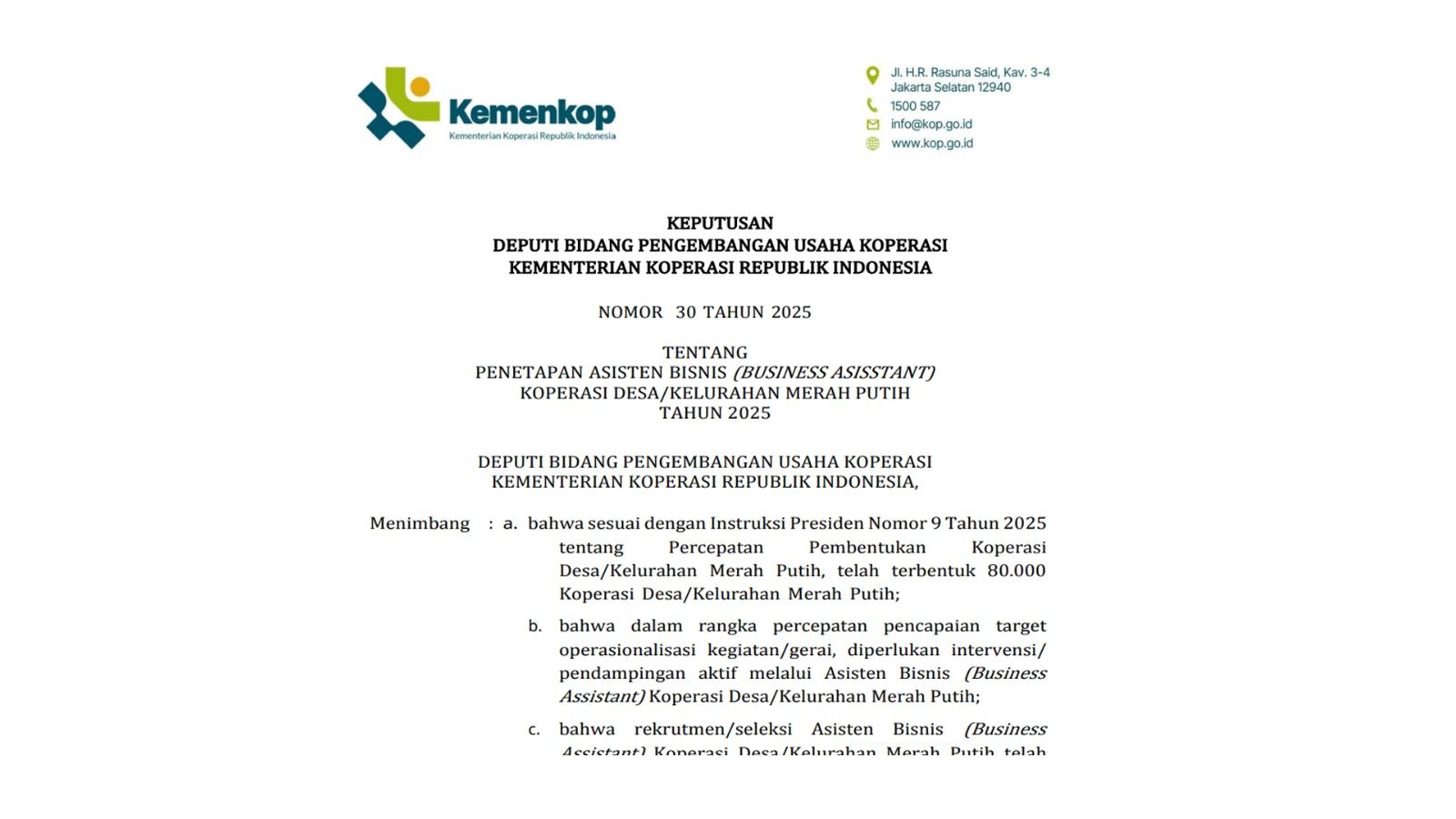 Melalui Surat Keputusan Deputi Bidang Pengembangan Usaha Koperasi Nomor 30 Tahun 2025 yang diterbitkan pada 30 September 2025, puluhan putra-putri daerah ditetapkan sebagai Asistensi Bisnis Koperasi Desa/Kelurahan Merah Putih.