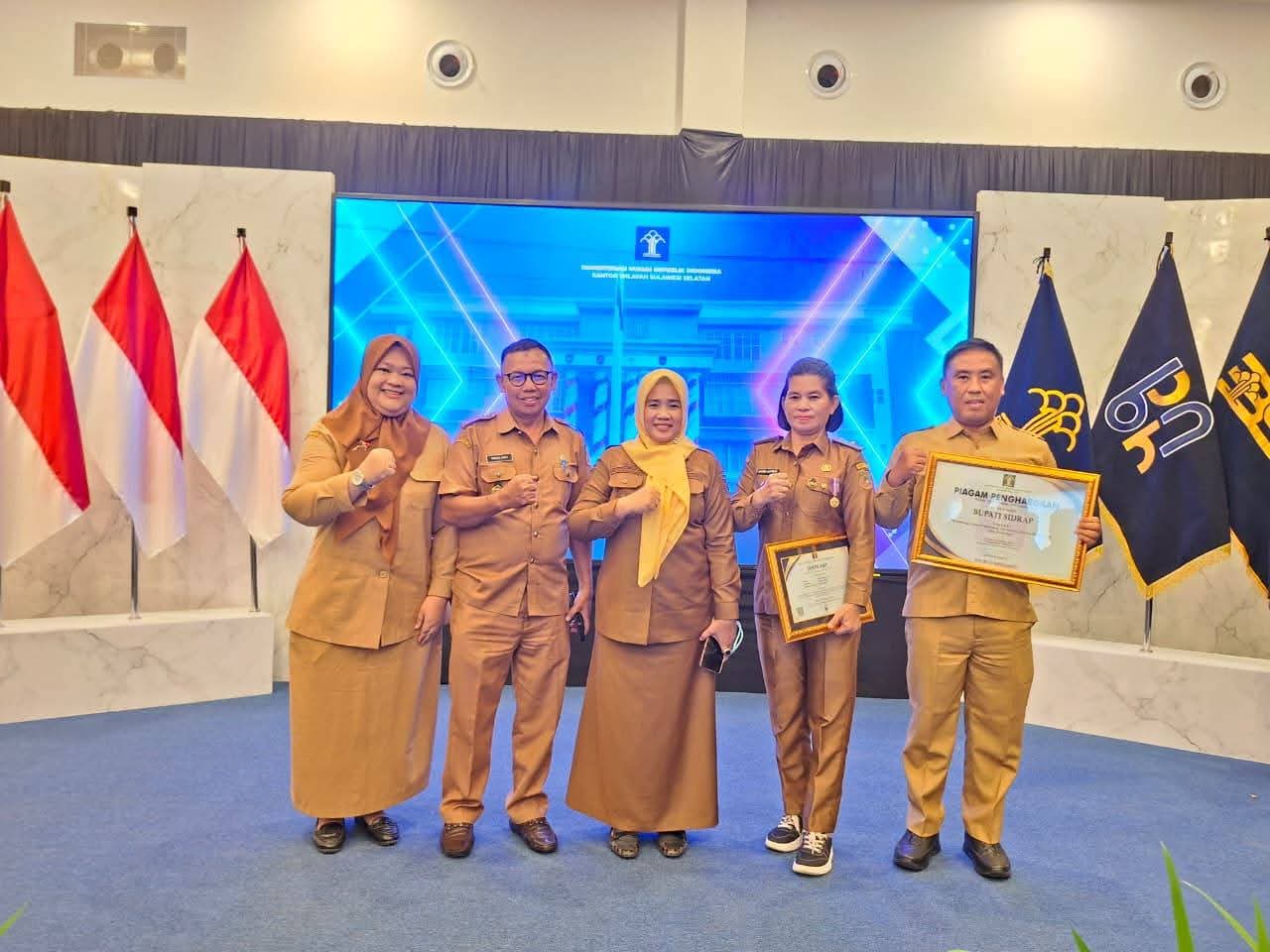 Penghargaan tersebut diserahkan oleh Kepala Kanwil Kemenkum Sulsel, Andi Basmal, diterima Wakil Bupati Sidrap, Nurkanaah.