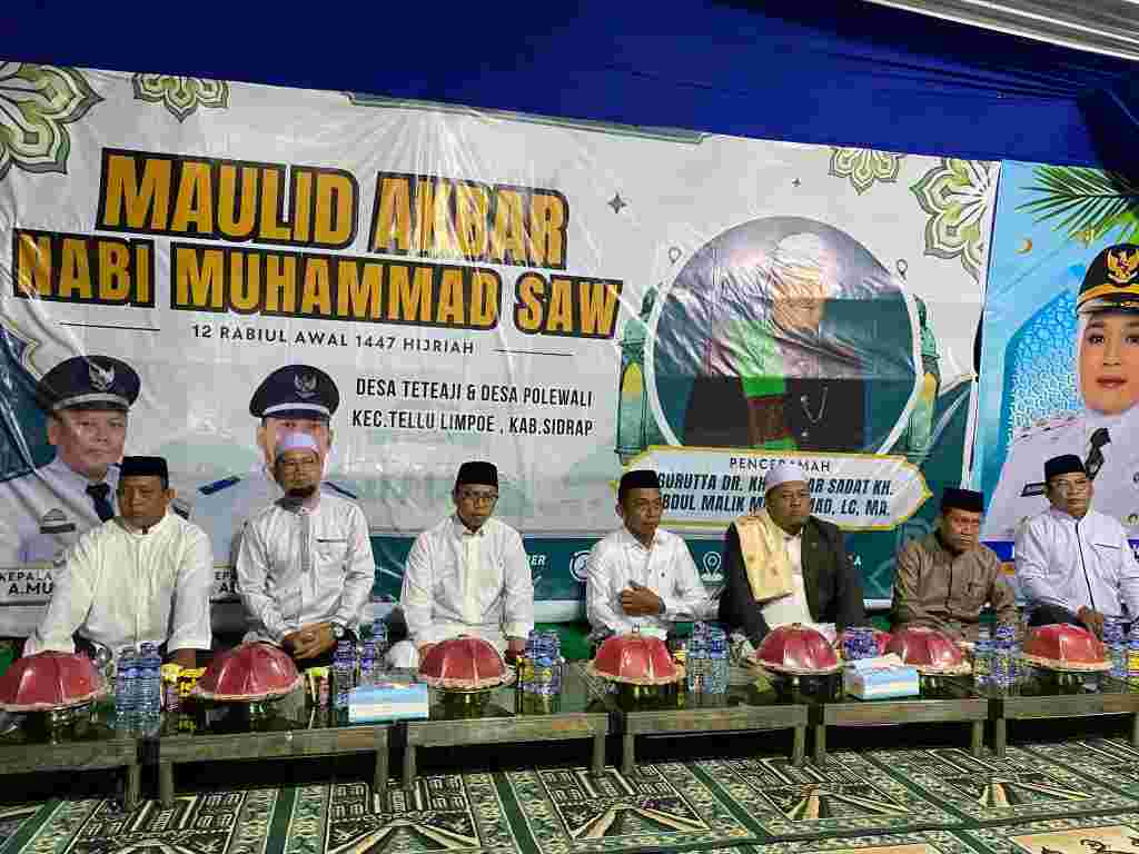 Sidrap, Katasulsel.com – Bupati Sidenreng Rappang, H. Syaharuddin Alrif, menghadiri peringatan Maulid Akbar Nabi Muhammad SAW yang digelar Pemerintah Desa Polewali dan Desa Teteaji, Kecamatan Tellu Limpoe, di Lapangan Polewali, Sabtu malam (18/10/2025).