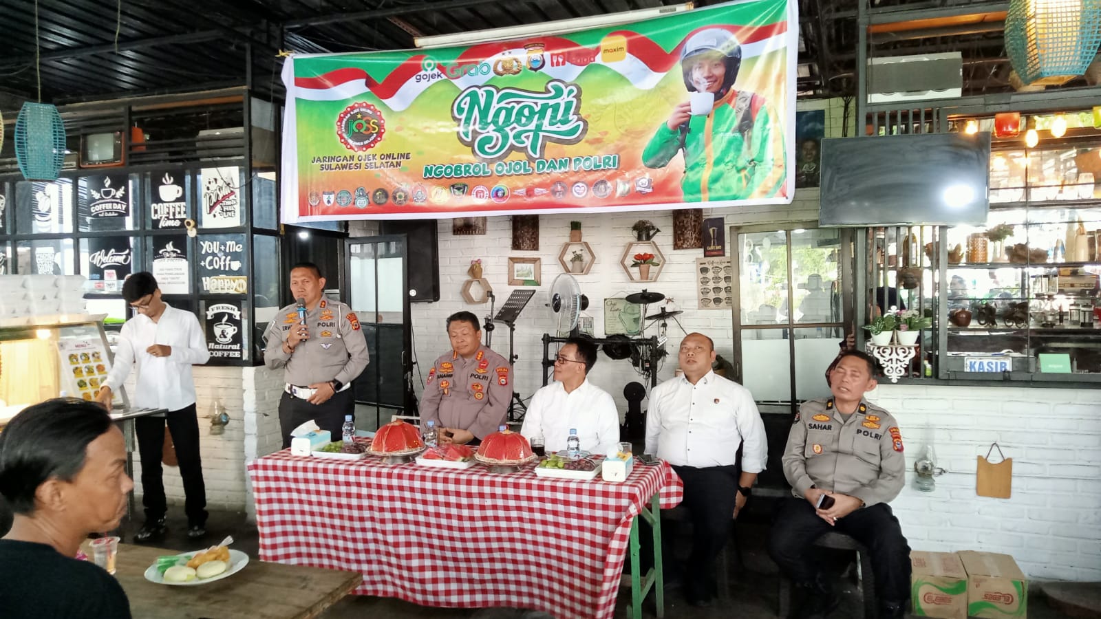 Acara bertajuk “Ngopi (Ngobrol Ojol dan Polri)” itu dimulai pukul 08.00 WITA, Selasa (20/10/2025). Namun sejak matahari naik sedikit di atas atap ruko, suasana sudah ramai.