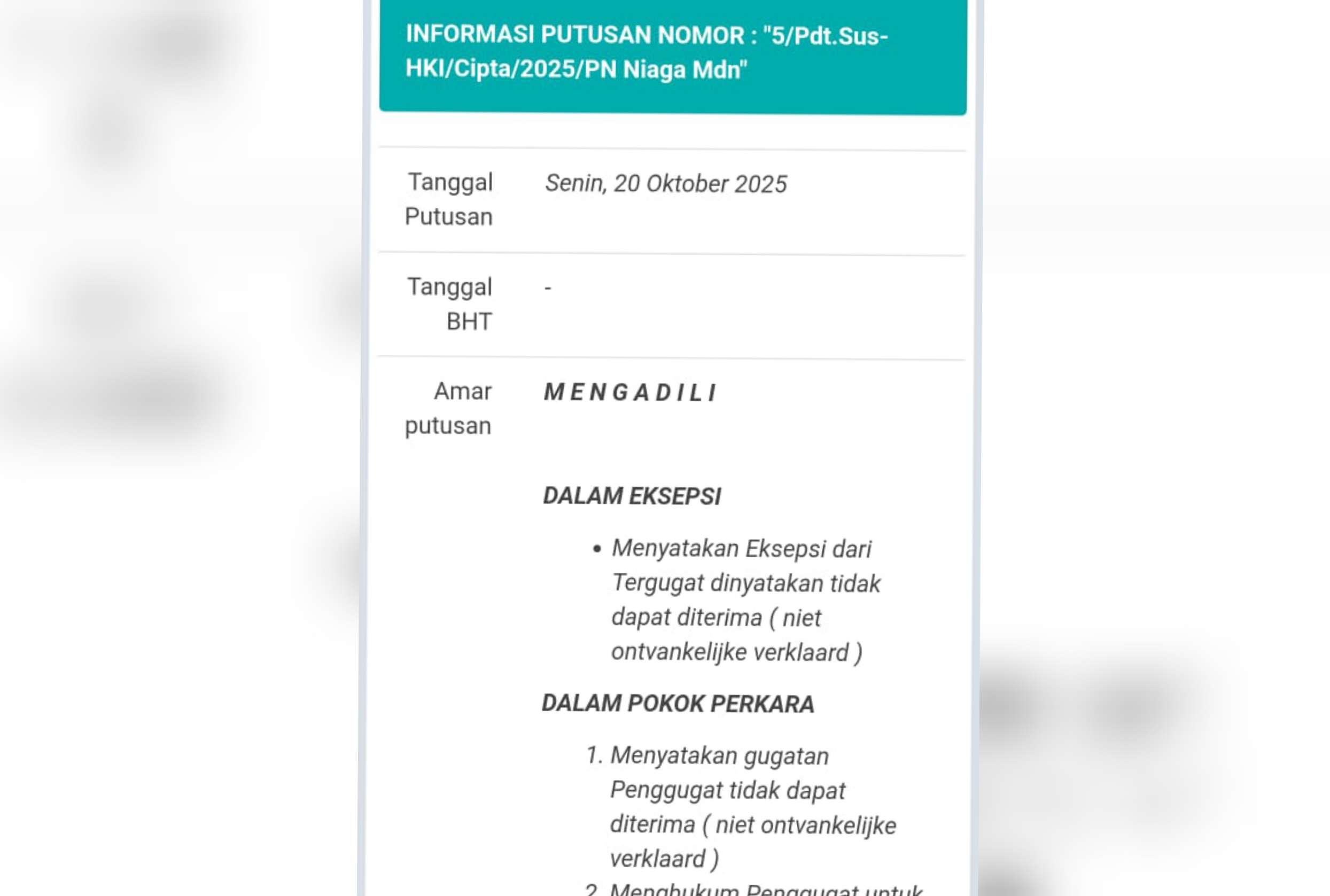 Berdasarkan amar putusan atas perkara No “5/Pdt.Sus-HKI/Cipta/2025/PLN Niaga Mdn” yang dirilis melalui sistem e-court pada Senin malam, 20 Oktober 2025 dijelaskan di poin mengadili bahwa “Menyatakan Eksekpsi dari tergugat dinyatakan tidak dapat diterima (niet ontvankelijke verklaard).