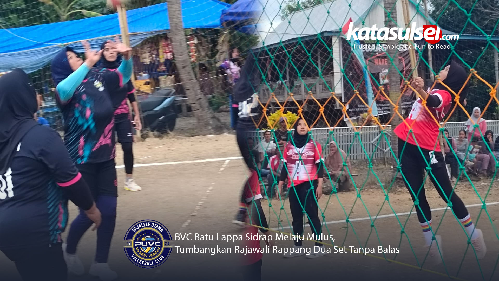BVC Batu Lappa Sidrap Melaju Mulus, Tumbangkan Rajawali Rappang Dua Set Tanpa BalasSidrap, katasulsel.com — Partai putri antara BVC Batu Lappa dan Rajawali (Rappang) dalam rangkaian Turnamen Volly Pajalele Cup II Tahun 2025 kembali menampilkan persaingan menarik dari para pemain pemula Sidrap. Meski kedua tim sama-sama baru di arena kompetisi daerah, kualitas permainan yang ditampilkan cukup menjanjikan. Laga berakhir dengan kemenangan bersih 2–0 untuk BVC Batu Lappa (25–15, 25–21).