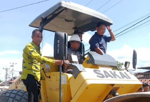 Syaharuddin tidak hanya melihat progres di lapangan, tetapi juga langsung mengoperasikan alat berat pemadat jalan.