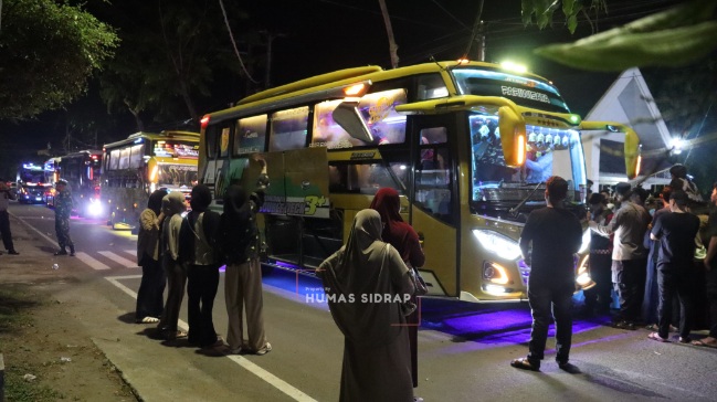 Barisan bus pariwisata sudah siap. Total 14 unit. Mesin menyala, tapi yang lebih terasa adalah getaran emosional keluarga yang melepas.