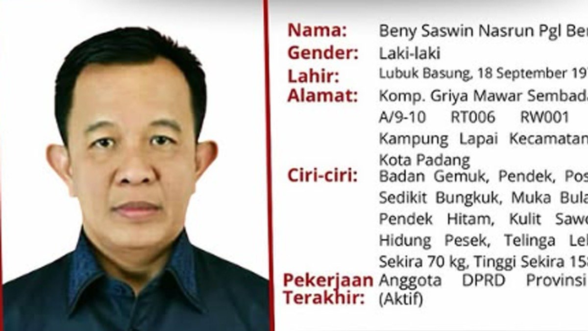 PADANG, Katasulsel.com – Kejaksaan Negeri (Kejari) Padang resmi menetapkan Beny Saswin Nasrun alias BSN, mantan anggota DPRD Provinsi Sumatera Barat, sebagai buronan kasus dugaan korupsi besar-besaran. Pria 52 tahun ini kini masuk Daftar Pencarian Orang (DPO) Kejari Padang.