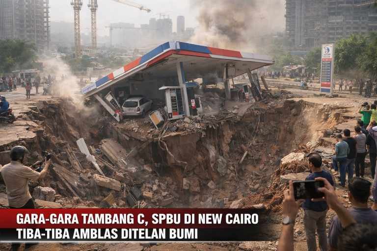 New Cairo, Katasulsel.com – Senin pagi itu, suasana di Fifth Settlement, New Cairo, berubah mencekam. Sebuah SPBU yang biasa ramai aktivitas, tiba-tiba dilahap bumi. Tanah di area itu ambles sedalam 15 meter, menyapu toko bunga, toko permen, dan sebagian fasilitas SPBU.