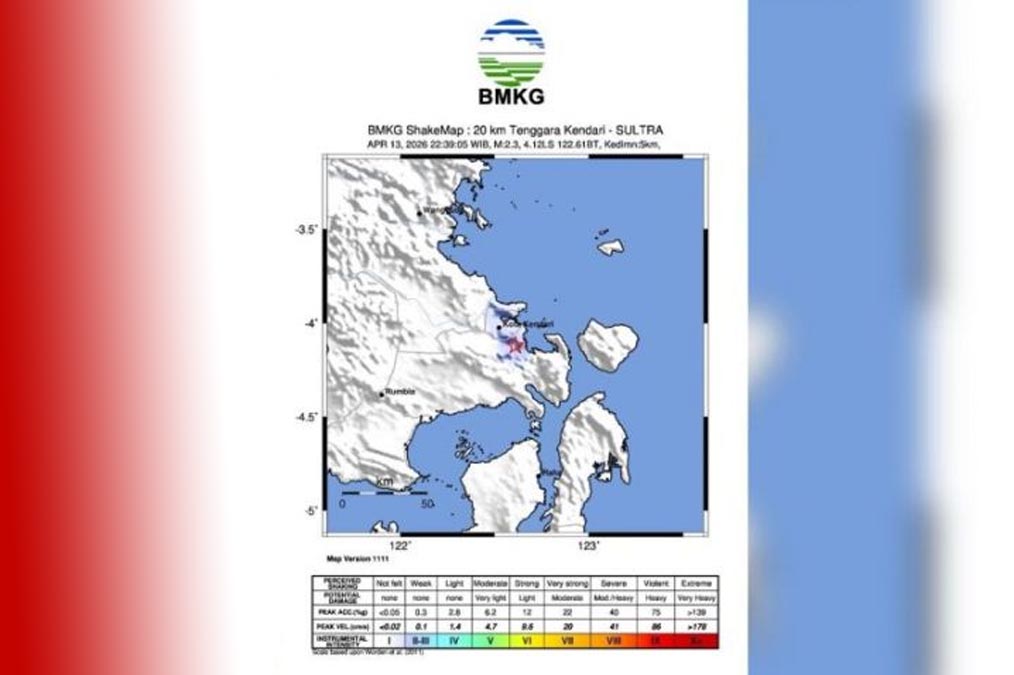 Kendari, katasulsel.com — Aktivitas tektonik kembali mengguncang wilayah Sulawesi Tenggara. Badan Meteorologi, Klimatologi, dan Geofisika (BMKG) mencatat gempa bumi terjadi di Kota Kendari dan dirasakan hingga Kabupaten Konawe Selatan, Sabtu (18/4/2026) pukul 05.13 Wita.
