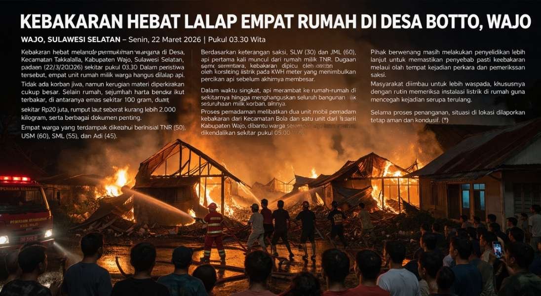 Kebakaran hebat melanda permukiman di Desa Botto, Kecamatan Takkalalla, Senin dini hari (22/3/2026) sekitar pukul 03.30 Wita. Dalam hitungan menit, api menjalar. Dari satu rumah… ke rumah lain.