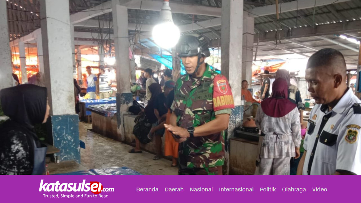 SIDRAP, Katasulsel.com – Pagi di Pasar Sentral Bilokka tak hanya diwarnai teriakan pedagang dan tawar-menawar ibu-ibu. Ada satu sosok berseragam loreng yang menyusuri lapak demi lapak.