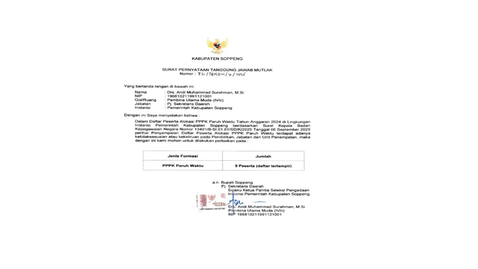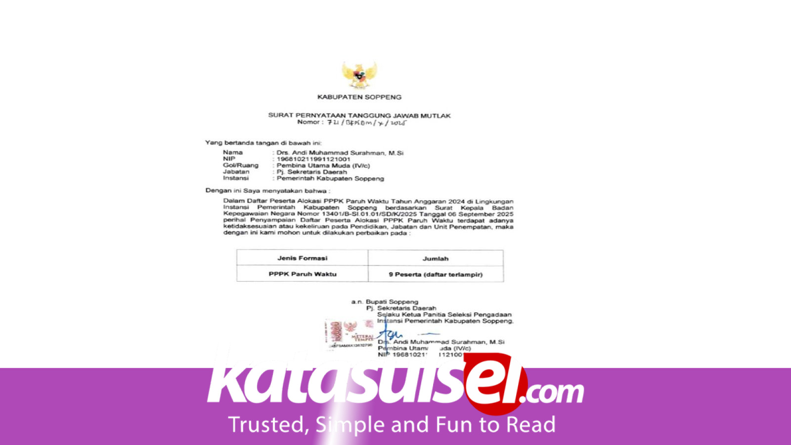 Yang membuat isu ini menarik perhatian publik bukan semata perubahan data itu sendiri, melainkan konstruksi tanggung jawab administratif yang menyertainya. Selain menandatangani surat permohonan, Pj Sekda juga membubuhkan tanda tangan pada Surat Pernyataan Tanggung Jawab Mutlak (SPTJM) serta surat resmi lain yang menegaskan posisinya sebagai Ketua Panitia Seleksi Pengadaan ASN di lingkungan Pemkab Soppeng.