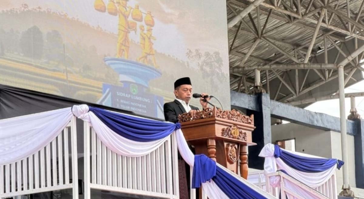 Di tengah ribuan jamaah, suara Bupati Syaharuddin Alrif terdengar berbeda: serak, berat, dan penuh emosi.