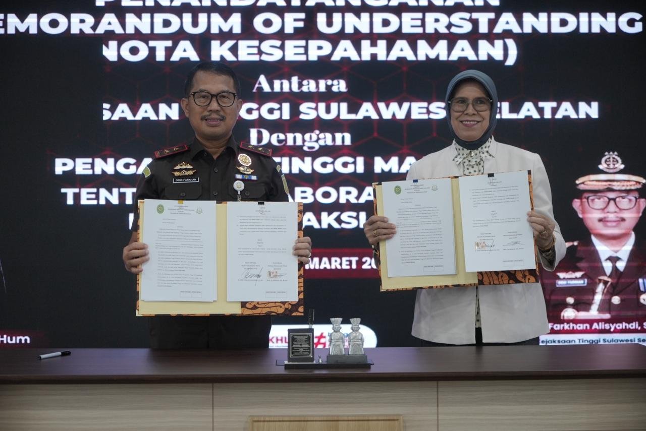 Makassar, Katasulsel.comKejaksaan Tinggi Sulawesi Selatan (Kejati Sulsel) memperkuat sinergitas penegakan hukum melalui penandatanganan Nota Kesepahaman (Memorandum of Understanding) dengan Pengadilan Tinggi Makassar tentang Kolaborasi Inovasi Layanan Saksi Prima. Acara yang berlangsung di Baruga Adhyaksa Kejati Sulsel, Rabu (4/3/2026) ini juga dirangkaikan dengan peluncuran buku berjudul “KUHAP Baru: Tantangan dan Harapan”.